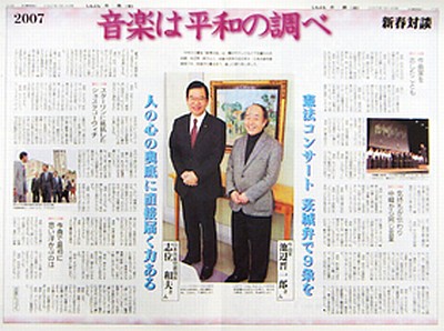 ■新春対談 音楽は平和の調べ水戸市生まれで舞台やテレビなどで活躍中の作曲家・池辺晋一郎さんと、音楽大好きの志位和夫・日本共産党委員長が対談。音楽から憲法まで、楽しく語り合いました。 池辺さんは、音楽・9条の会の呼びかけ人としても活躍中。93年以来、週刊「うたごえ新聞」に連載中のエッセイ「空を見てますか」が単行本になり、新日本出版社から発行されています。 →池辺さんのプロフィール |