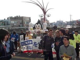 日本共産党からは、福田明茨城北部地区委員長、大曽根勝正日立市議(写真下・左端)らが参加し、電鉄問題での市議会の状況を知らせる「民主日立」を配布しました。