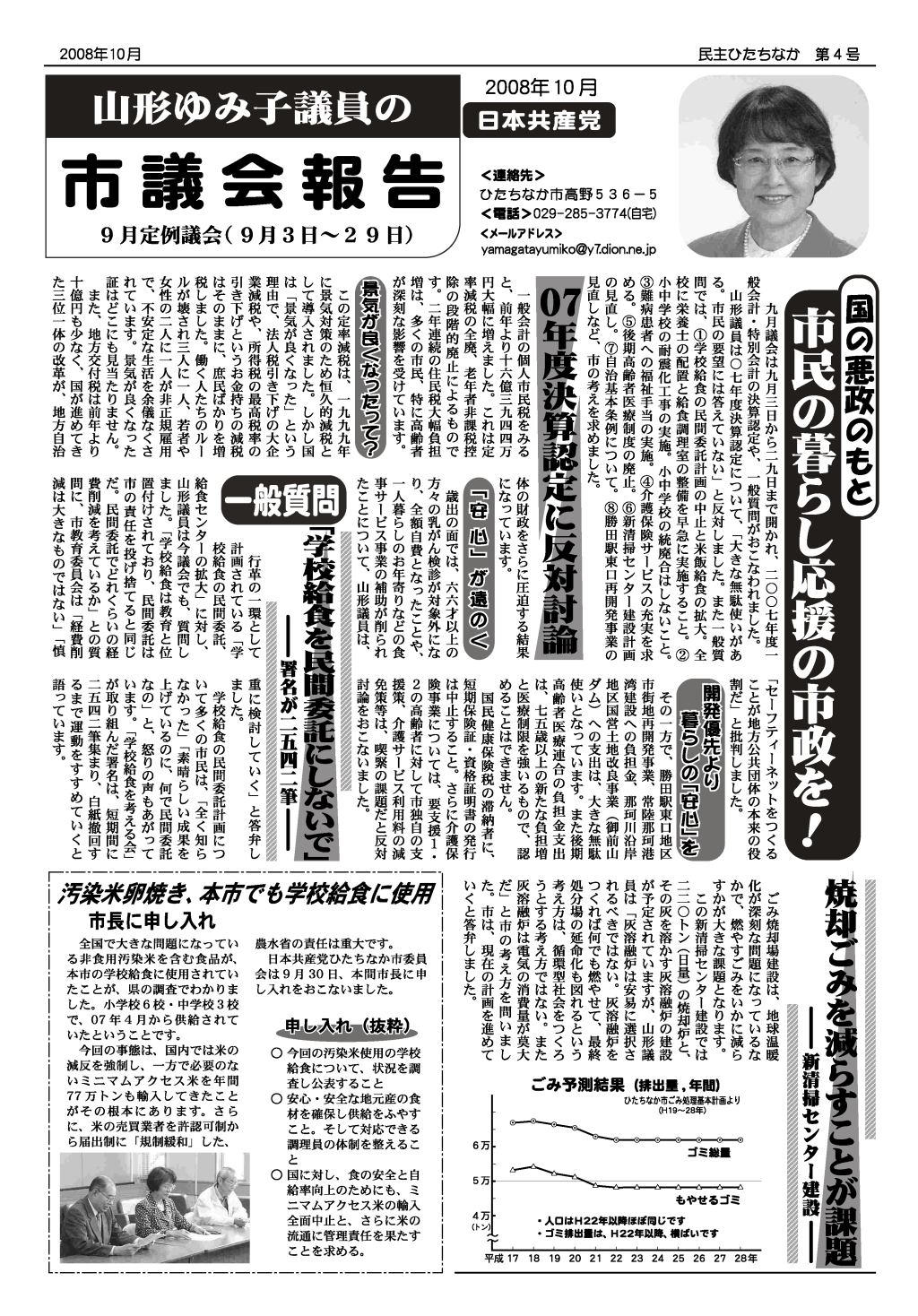 「山形ゆみ子議員の市議会報告」(ひたちなか市) 第4号 2008年10月 字が小さくて読みにくい方、印刷して読まれる方は、PDFでどうぞ。 |オモテ|ウラ|市議会報告 目次 |