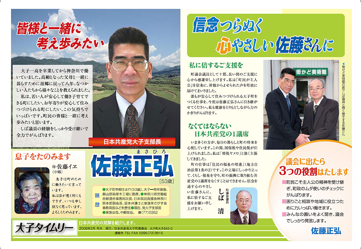 「大子タイムリー」08年2月号外 (大子町議選予定候補・佐藤正弘紹介特集) 字が小さくて読みにくい方、印刷して読まれる方は、PDFでどうぞ。