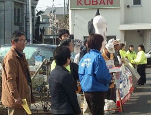 日本共産党からは、福田明茨城北部地区委員長、大曽根勝正日立市議(写真下・左端)らが参加し、電鉄問題での市議会の状況を知らせる「民主日立」を配布しました。