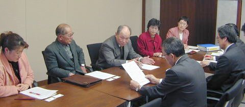 要請書提出には、中村敏夫会長、佐藤利彦副会長、大名美恵子世話人さん、川崎篤子世話人が参加。日本共産党の山中たい子県議が同席しました。 |