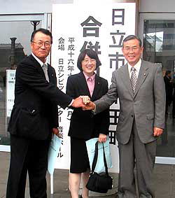 | 新市の面積は約225平方キロ。人口は20万4千人余(9月末現在)。水戸市に次ぐ県内第2位の都市に。 新市の議員総数は45人(日立市の欠員1を除く)。日本共産党は日立市に2議席、十王町に1議席を有していたため、3議席に。 新「日立市」発足に伴い、茨城県は23市41町14村となります。(04年11月2日8「赤旗」より) |