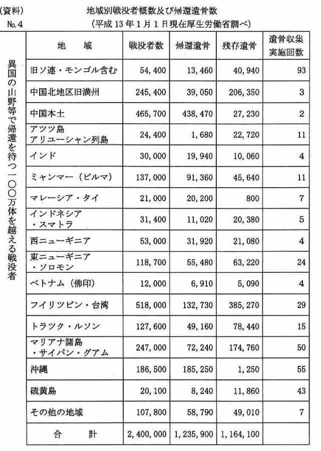 さらに驚きを禁じ得なかったのは、戦後も平成十三年一月一日現在で、遺骨の帰らない戦没者が一〇〇万体も異国の山野に残っていることです。これは厚生労働省の調べによるものでこれも資料として附しました(巻末資料参照)。