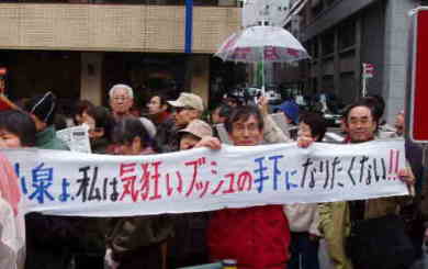 写真の横断幕「小泉よ、私は気狂いブッシュの手下にはなりたくない!!」は集会の前日、慌てて作って行ったものですが、沿道の人達から「確かに、それは言える」と少しばかり 共感を得たものです。